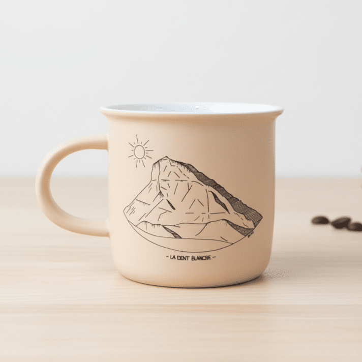La bella tazza in ceramica la sua bella impressione del Dent Blanche . Con la sua altitudine di 4.357 m, si trova orgoglioso tra il Vallon de Ferpècle e Zinal in Valais. In effetti, per le persone, è molto più di un vertice: è un simbolo di bellezza naturale e sfide da affrontare, una vera gemma delle Alpi svizzere.